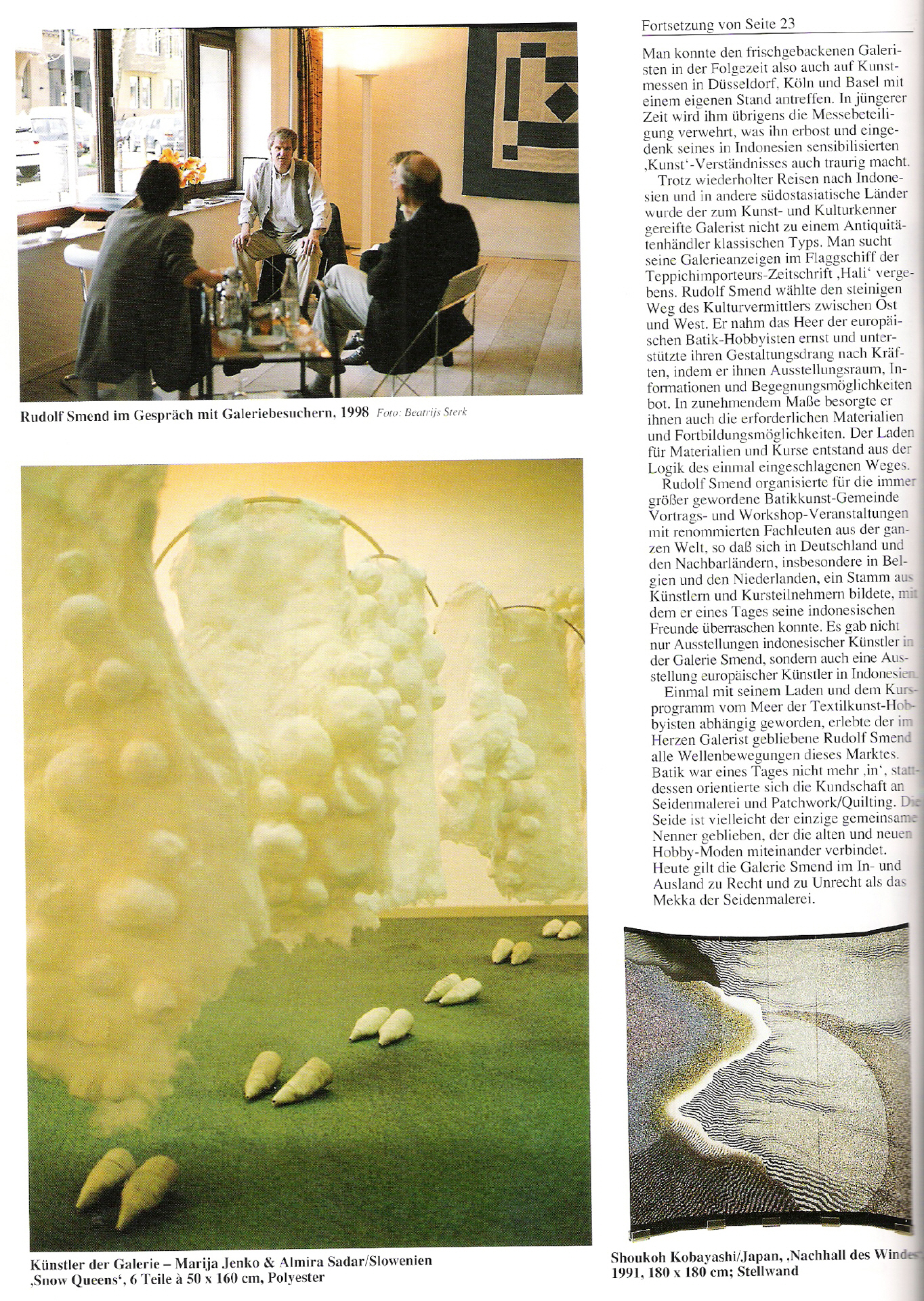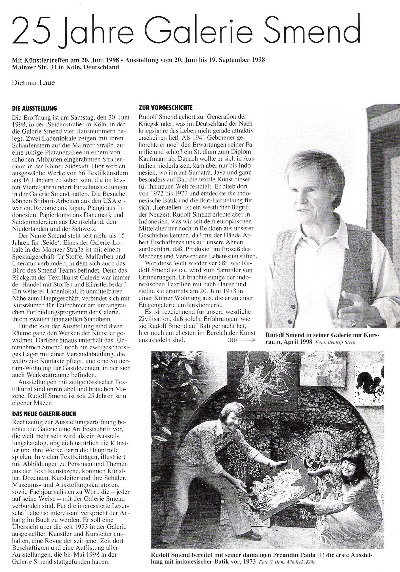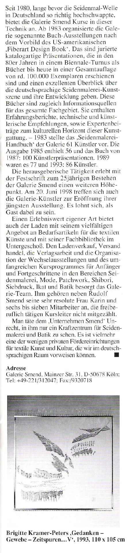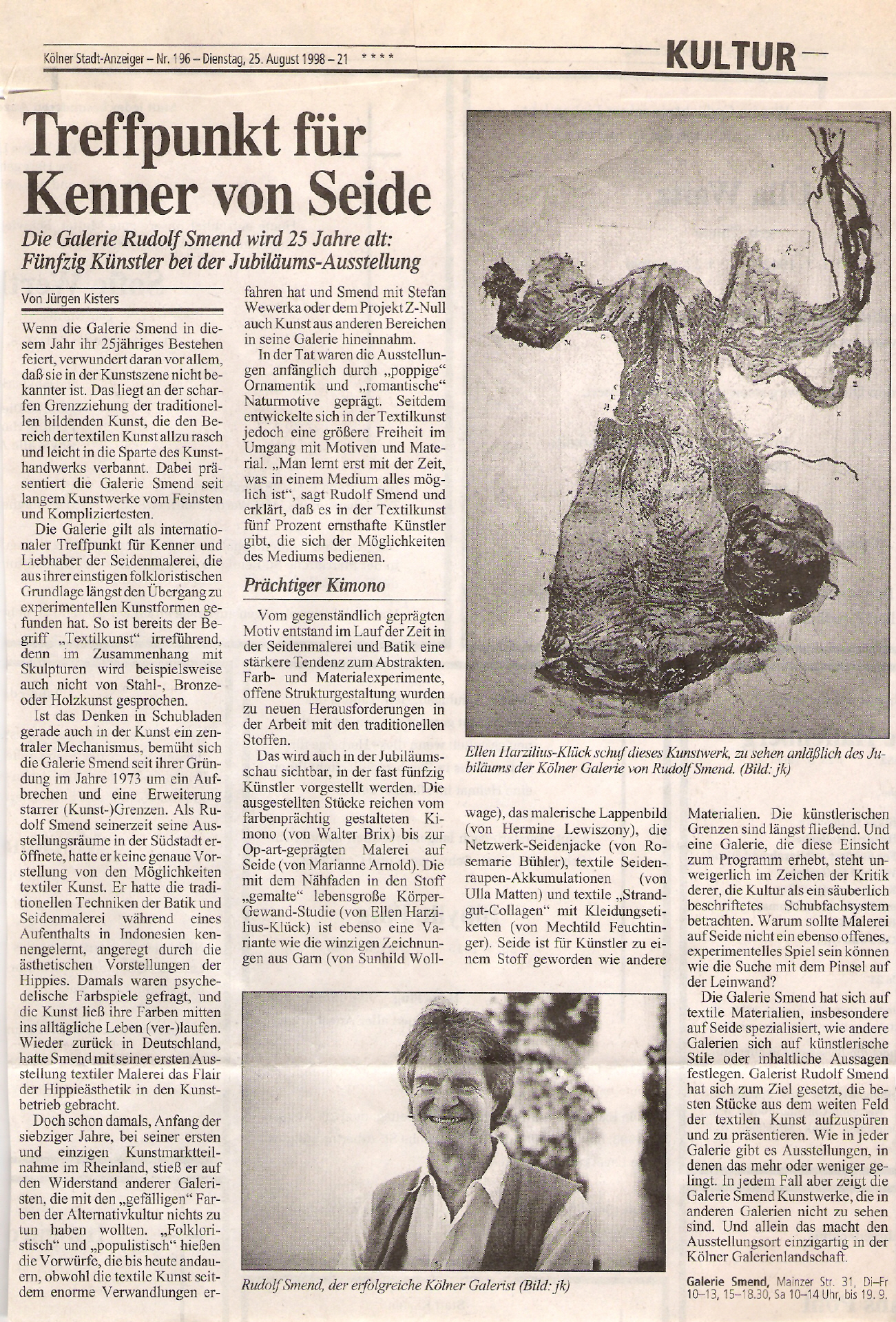 17 „Treffpunkt für Kenner von Seide - Die Galerie Smend wird 25 Jahre alt -Fünfzig Künstler bei der Jubiläums-Ausstellung“ von Jürgen Kisters in Kölner Stadt Anzeiger 25.8.1998
