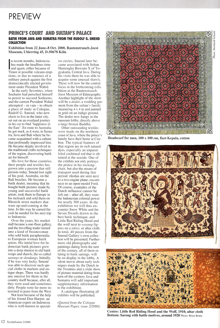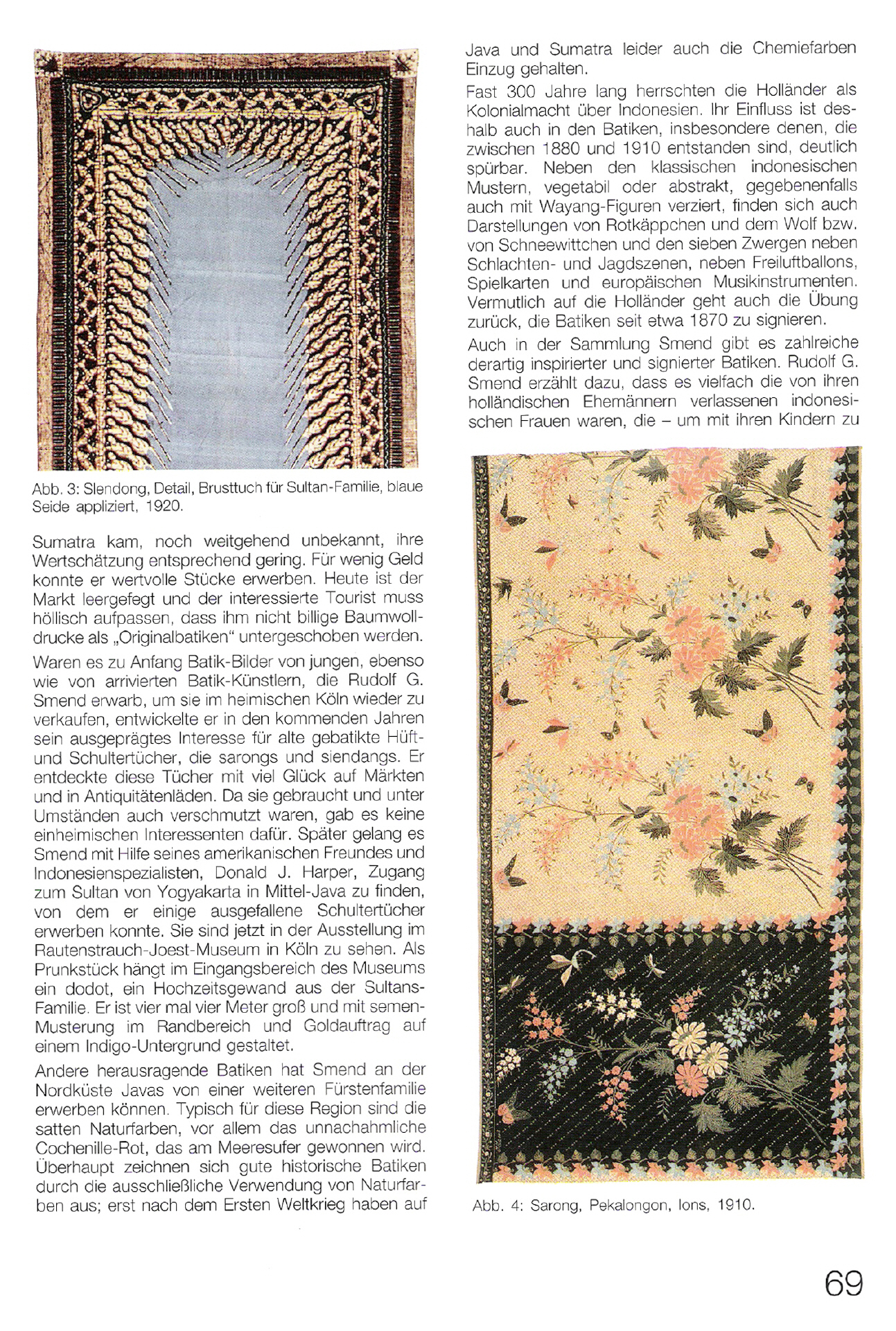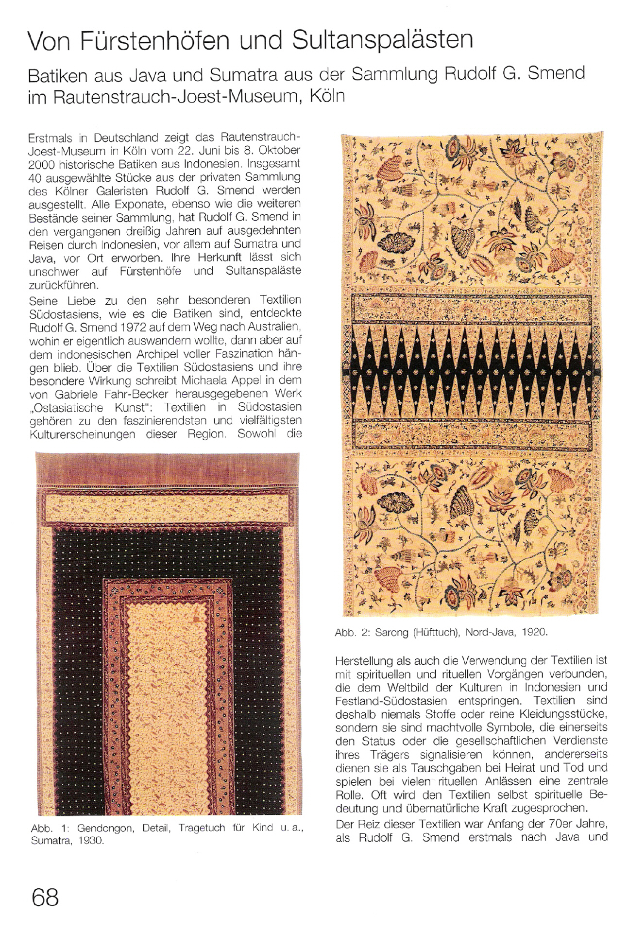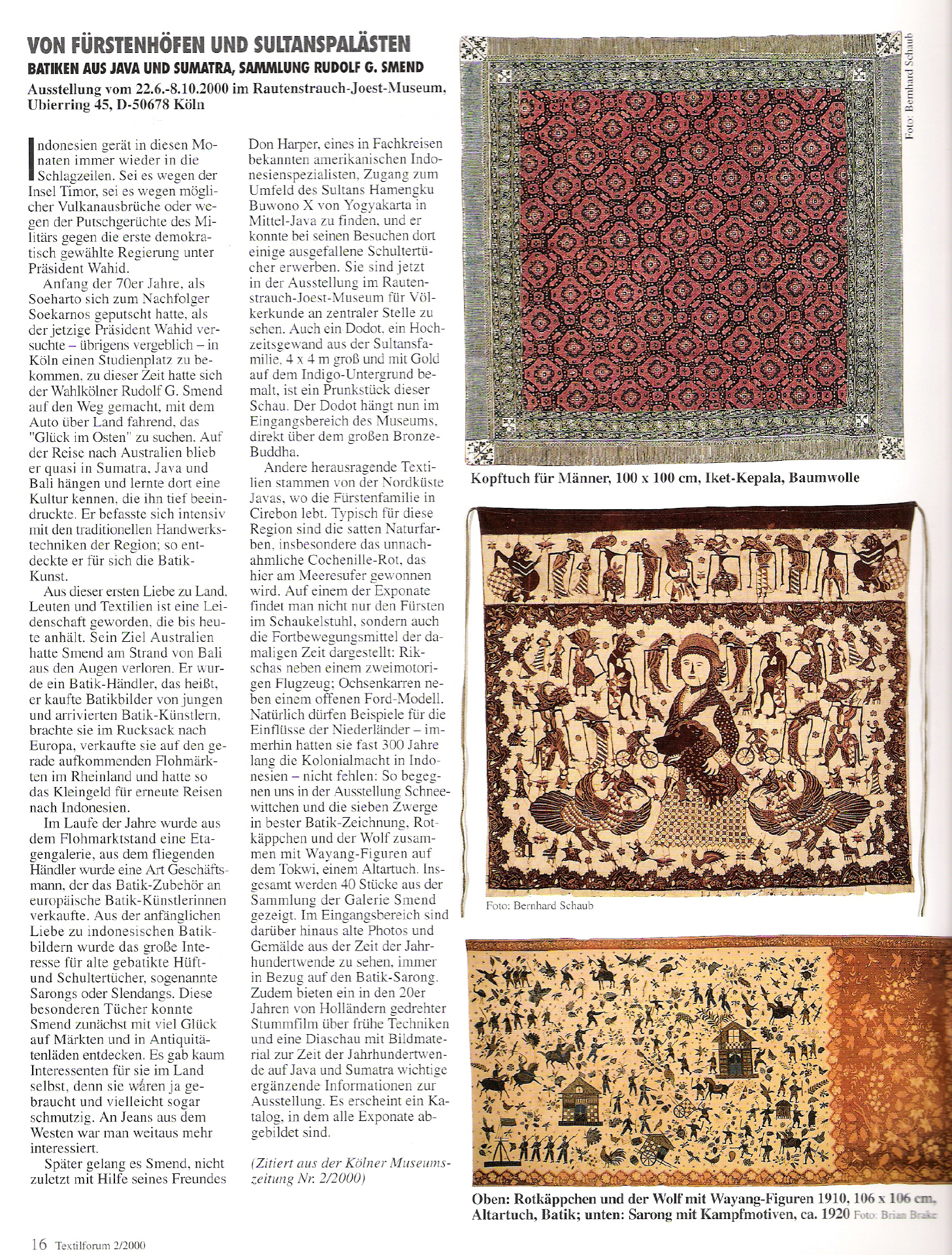 – Batiken aus Java und Sumatra aus der Sammlung Rudolf G. Smend im Rautenstrauch-Joest-Museum, Köln“ von Antje Soléau in textilkunst international Heft 2´2000 S. 68ff
