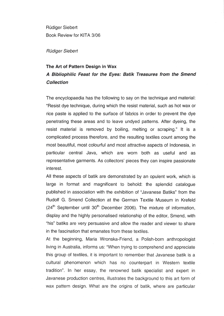 A Bibliophilic Feast for the Eyes: Batik Treasures from the Smend Collection.” A Book Review by Rüdiger Siebert in: Südostasien Magazin